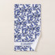 Este conjunto único de toalhas temidas de vôlei apresenta um padrão aleatório de vários tamanhos de volicombolas azuis e brancas estilizadas viradas em todos os sentidos em um fundo branco - personalize a toalha de banho e a toalha de mão com seu nome - por katz_d_zynes