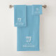 Um belo conjunto de toalhas de banheiro de meninos azuis que podem ser personalizadas para seu nome e inicial. O design usa uma fonte de tipografia infantil para o nome e o nome iniciais. Decorar o banheiro do seu filho com este belo conjunto.