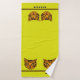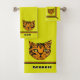 Este conjunto de toalhas espessa e veluda apresenta um bonito estilo de desenho animado com o rosto do tigre em laranja e preto em um fundo brilhante de puce (amarelo-esverdeado) com bordas preto e laranja alternadas acima de uma grande banda de puce no fundo. O tamanho do banho está pronto para personalizar com o seu nome (ou o nome do seu filho), a toalha da mão tem espaço para um monograma, o pano de lavagem tem início.
