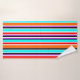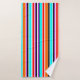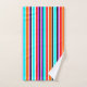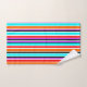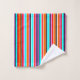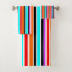 Este conjunto de toalhas tem um design simples de faixas verticais de espessuras variadas em vermelho, laranja, roxo, preto, azul claro e branco.