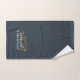 Personalized elegant manly set of three bath towels, personalizable customizable with monogram, initial letters and name. Masculine stylish neutral coastal navy blue background appropriate for a gentleman, elegant gold calligraphy script handwritten initial letters, and classy black serif typography for the name. Unique useful bathroom essentials accessories. Premium look, monochrome, modern, minimalist, simple, monogrammed, easy to match in any ambient, especially in lake house, beach house, nautical marine maritime design style. Elevate your bath decor aspect with this timeless yet trendy pieces. Make a thoughtful custom gift under 60 dollars for him, with this beautiful set of bath towels or you can choose each one separately. Suitable for many occasions and celebrations, like birthday, Father’s Day, Christmas, graduation, anniversaries, even retirement present. . Also a beautiful aesthetic housewarming, new homeowner gift, newlyweds or engaged couple gift, or a present for a perfect host that loves decorating with style. A great idea to use for staging the house for sale, to attract potential buyers.