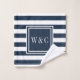 Conjunto de toalhas de monograma de iniciais personalizadas elegantes, com um padrão listrado azul e branco marinho com as suas iniciais. Projetado por Thisnotme©