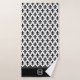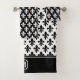 Características ajustadas atrativas desta três toalha da parte um teste padrão preto e branco da flor de lis. A grande toalha de banho tem um teste padrão de símbolos pretos da flor de lis em um fundo branco. A toalha de mão e o washcloth têm um teste padrão da flor de lis branca em um fundo preto. A toalha de banho igualmente tem uma beira inferior preta, com seu monograma no branco em uma bandeira ornamentado alinhada branco. Bonito!