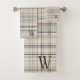 Um lindo banho de xadrez sentou, sua inicial de monograma está no canto inferior direito. Este pano de lavagem, toalha de mão e toalha de banho tem um design de xadrez castanho e azul. Compre o seu hoje!
