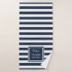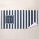 Conjunto de toalhas de banho monograma personalizado elegante, com marinho de padrão listrado azul e branco com suas iniciais e nome da família, com a data estabelecida em um quadrado marinho de borda azul com um texto branco clássico. Projetado por Thisnotme©
