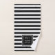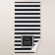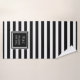 Conjunto de toalhas de monograma personalizado elegante com padrão listrado preto e branco com suas iniciais e nome da família com a data estabelecida em um quadrado bordado preto com um texto branco clássico. Projetado por Thisnotme©