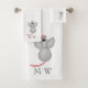 Bath towel set, consisting of a face cloth, hand towel and bath towel with a mouse design. You can customise this bath towel set with any text of your choice. Should you require any help with customising then contact us through the message link on this page. Mouse design bathroom towel set