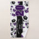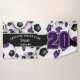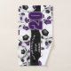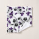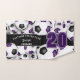 Esta toalha espiritual de equipe para um jogador de futebol apresenta bolas de futebol de tamanho variado com cores roxas e pretas em equipe que se viraram em todos os sentidos em um fundo branco - personalize a toalha de mão e a toalha de banho com um número de camisa proeminente em roxo sobre uma faixa preta de comprimento do cheio, na qual você também pode personalizar o nome do atleta, nome da equipe e nome mascote em branco - por katz - por katz