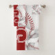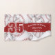 Esta toalha legal para jogadores de beisebol ou softball tem tamanhos variados, bolas de baseball brancas realistas e limpas viradas em todos os sentidos em um fundo branco e um número de camisa proeminente em vermelho sobre uma faixa vermelha em preto, comprimento do cheio, na qual você também pode personalizar o nome do atleta, nome do grupo e nome mascote - por katz_d_zynes
