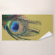 Grande pena de pavão em tons verdes azuis sobre fundo dourado, sotaque mais eficaz em decoração moderna. Pavão é um símbolo de beleza, renascimento e riqueza.
