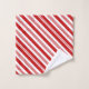 Padrão irregular de cana-de-açúcar com faixas alternadas, espessas e finas, em vermelho e branco. As toalhas de mão e banho exibem listras brancas em ambas as extremidades com Feliz Natal em fonte vermelha que pode ser personalizada com sua própria mensagem.