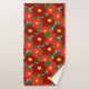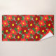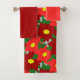 Este conjunto de toalhas tem um pano de lavagem vermelho-claro, uma toalha vermelha, e uma toalha de banho com um design de Natal de poinsettias agrupadas num campo de azul-claro.