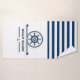Esta imagem apresenta um nome de barco, corda e âncora em um fundo listrado azul e branco marinho.