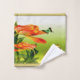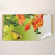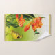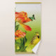 Imagem bonita de um pássaro amarelo com uma flor de orquídeas laranja com uma borboleta verde e preta voando ao lado da planta tropical.em uma impressão de óleo