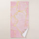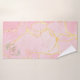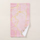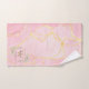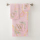 Conjunto de toalhas de banho com nome de monograma em aquarela verde elegante com monograma dourado inicial em um fundo de geodo de ágata rosa. Desenhado por Thisisnotme©