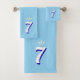 Número sete da sorte personalizado com três penas nas cores branco e azul real em conjunto de toalhas de banho de fundo turquesa..