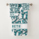 Este conjunto único de toalhas temidas de vôlei apresenta um padrão aleatório de várias dimensões de chaleiras e volichões brancos estilizados rodados em todos os sentidos num fundo branco personalizável - personalize a toalha de banho e a toalha de mão com seu nome - por katz_d_zynes