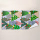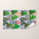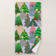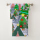 Este conjunto de toalhas tem um desenho de árvores de Natal em vários tons de verde, rosa, prata e dourado com diferentes decorações.