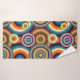Este conjunto de toalhas tem um pano de lavagem azul claro, uma toalha azul-escura, e uma toalha de banho com um design Bauhaus de diferentes grupos de círculos concêntricos em cores da década de 1970.