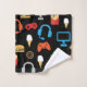 Os miúdos personalizaram o grupo de toalha do teste padrão do Gamer dos petiscos do jogo de vídeo. O monograma e personaliza com nome na grande toalha de banho. Teste padrão de controladores do jogo de vídeo, fast food, rosquinhas do gelado, no fundo preto. Teste padrão do Gamer. www.SamAnnDesigns.com