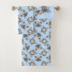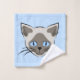 Este conjunto de toalhas é embelezado com um design branco que apresenta faces gráficas siamesas de gato em uma versão clara e escura com olhos azuis claros. A cor azul pálida do fundo pode ser personalizada para corresponder ao decorador do banheiro.