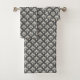 Um conjunto de toalhas e panos de rosto apresenta um padrão de damasco floral branco clássico em um fundo cinza escuro. Os acessórios de banheiro transmitem um tom sofisticado e elegante.