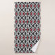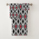 Conjunto de toalhas de banheiro com um padrão de diamante preto, branco e vermelho.