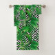 Plantas tropicais verdes em um padrão geométrico preto e branco, este conjunto de toalhas de banheiro é um sotaque perfeito para sua decoração.