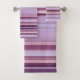 Uma adorável toalha de banheiro listrada em uma variedade de cores roxas mauve com minúsculas linhas de ouro rosa.