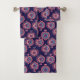 Padrão decorativo colorido de romã sobre fundo azul escuro.