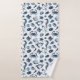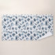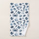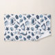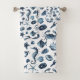 Belo conjunto de toalhas de banho azul e branco, com estrelas-do-mar azuis, caranguejo, cavalos-marinhos e conchas marítimas.