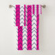 Conjunto de toalhas geométricas branco e cor-de-rosa Stripe Chevron. Este design apresenta uma faixa vertical rosa e branca e um padrão de faixa horizontal de gesso cor azul marinho.
