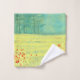 Uma pintura de paisagem amarela e verde em verde e amarelo de um campo ou cheio de flores silvestres com uma floresta de pinheiros no horizonte. Arte original de Nic Squirrell.