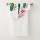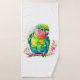Conjunto de toalhas com uma bela ilustração de papagaio. Um pequeno papagaio verde com cores azuis e amarelas se misturando. O pescoço tem um tom vibrante de rosa avermelhado.