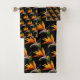 Conjunto de toalhas de banho que mostra a foto de um florescimento laranja da ave tropical da Planta do Paraíso impresso em um padrão repetitivo em um fundo preto. Também chamada de Flor de Crane. Um design floral impressionante! Encomenda toalhas separadamente ou como um conjunto.