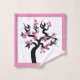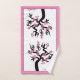 Árvore de cereja da sakura preta com pássaros apaixonados, flores e toalha de banho rosa. Ele apresenta uma sakura preta com flores cor-de-rosa com corações pretos no centro e um par de aves amadoras. Seu nome é escrito em uma fonte de estilo de script.