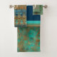 Na moda, arte, conjunto único de toalhas de banho, desenhado pelo PiccoGrande, com Patina inspirado em cores azuis, lacrimejantes e sujeira e texto personalizado.