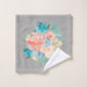 Um banho personalizado com toalha de banho, toalha de mão e pano de lavagem, com um buquê de pêssego e aqua misturado flores em aquarelas moles. O fundo mostrado é uma cinza neutra. Personalize com seu nome ou outro texto desejado. Você também pode excluir o nome se preferir o conjunto de toalhas sem texto.