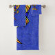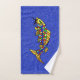 Este conjunto de toalhas de banho que inclui uma toalha de lavagem, uma toalha de mão e uma toalha de banho são um azul vibrante profundo com faíscas brancas e um peixe brilhante brilhante brilhante brilhante e colorido fantasia com escamas e barbatanas em laranja, amarelo, vermelho, azul e verde. Compre o conjunto inteiro ou individualmente.