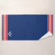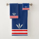 Penas brancas modernas e elegantes no conjunto azul, branco e vermelho das toalhas de banho.