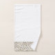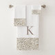 Neste elegante conjunto de toalhas de banho está um pano de fundo branco para contrastar com pequenas penas de ouro reluzentes como borda. Elegante e moderno. Pode ser personalizado com uma letra na toalha grande.