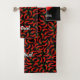 Pimentos de pimentões quentes. Cor de fundo personalizada. Ícone de pimenta no pano de lavagem. Um padrão perfeito na mão e toalha de banho. Texto personalizado nas três toalhas.