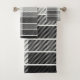 Este design de conjunto de toalhas de banho apresenta uma grade de pinstripes diagonais brancas e pretas, criando uma interação contemporânea de cores e linhas.