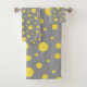 Bring a contemporary splash of color into your bathroom with this eye-catching yellow and gray polka dot pattern bath towel set. The design features a bold, graphic mix of different-sized lemon yellow dots scattered playfully across a chic, neutral dark gray background. This trendy, modern design is perfect for adding a fun, gender-neutral accent to your master or guest bathroom decor. A unique, stylish way to refresh your space or give as a housewarming gift.