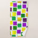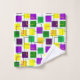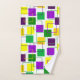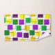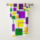 Este conjunto de toalhas tem um design geométrico de quadrados em roxo, amarelo e verde espalhados com seus contornos.