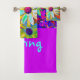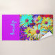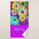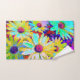 Um conjunto de banhos com uma imagem de margaridas de abstrato primavera. A toalha de banho tem um fundo com texto a ler "Primavera". O texto é personalizável e pode ser alterado pelo comprador para ler outra coisa.