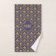 A set of towels with a seamless repeating purple and gold quatrefoil pattern with fleur de lys symbol (lilies). With a customizable text field for your initials.