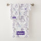As cores de roxo e azul claro são usadas no fazer deste conjunto de toalhas de banho sem costura do boneco de neve. Ilustração desenhada à mão de um bonitinho bonitão com chapéu, cachecol e nariz de cenoura. Ele fica numa colina de neve perto de uma árvore de Natal com uma estrela. O texto "Feliz Natal!" está incluído em padrão.