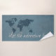 Que a aventura comece o design de texto com a decoração do mapa mundial sobre fundo azul e verde