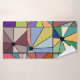 Este conjunto de toalhas tem um pano de lavagem de ouro, uma toalha de mão turquesa, e uma toalha de banho com um desenho abstrato que é feito de nove quadrados com um círculo e "raios" saindo do círculo em muitas cores diferentes.